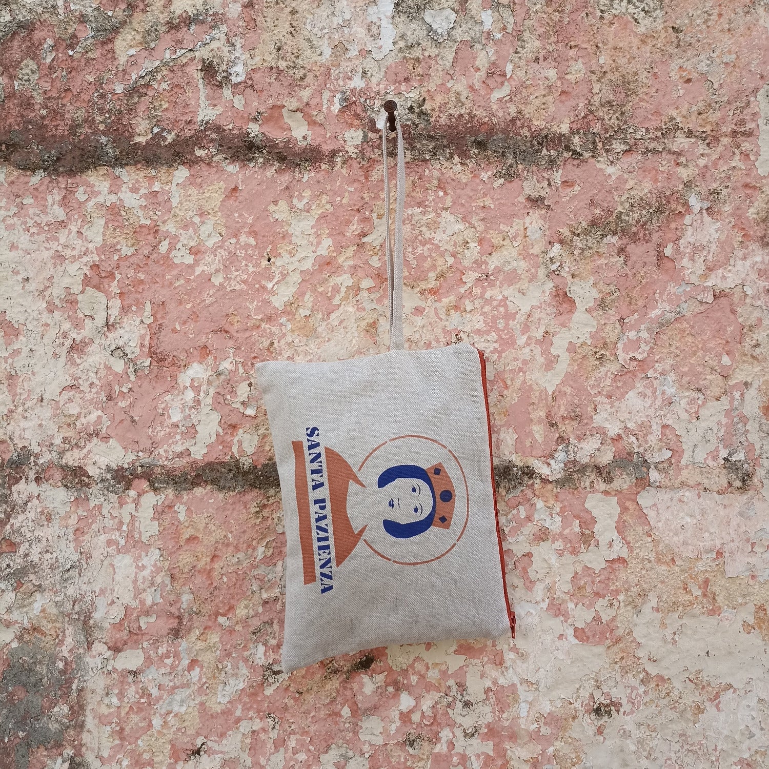 Pochette in cotone naturale, cucite e stampate a mano con tecnica stencil