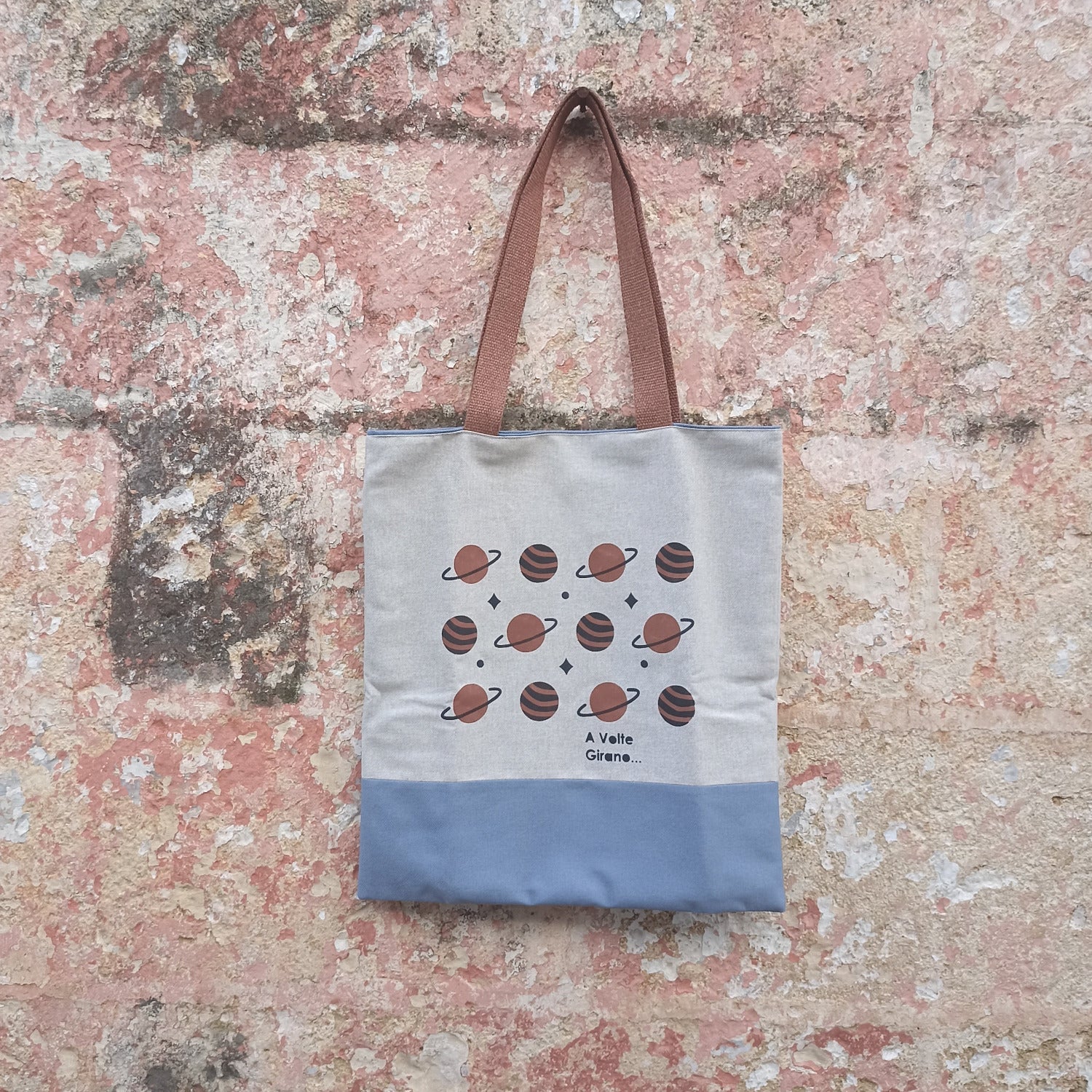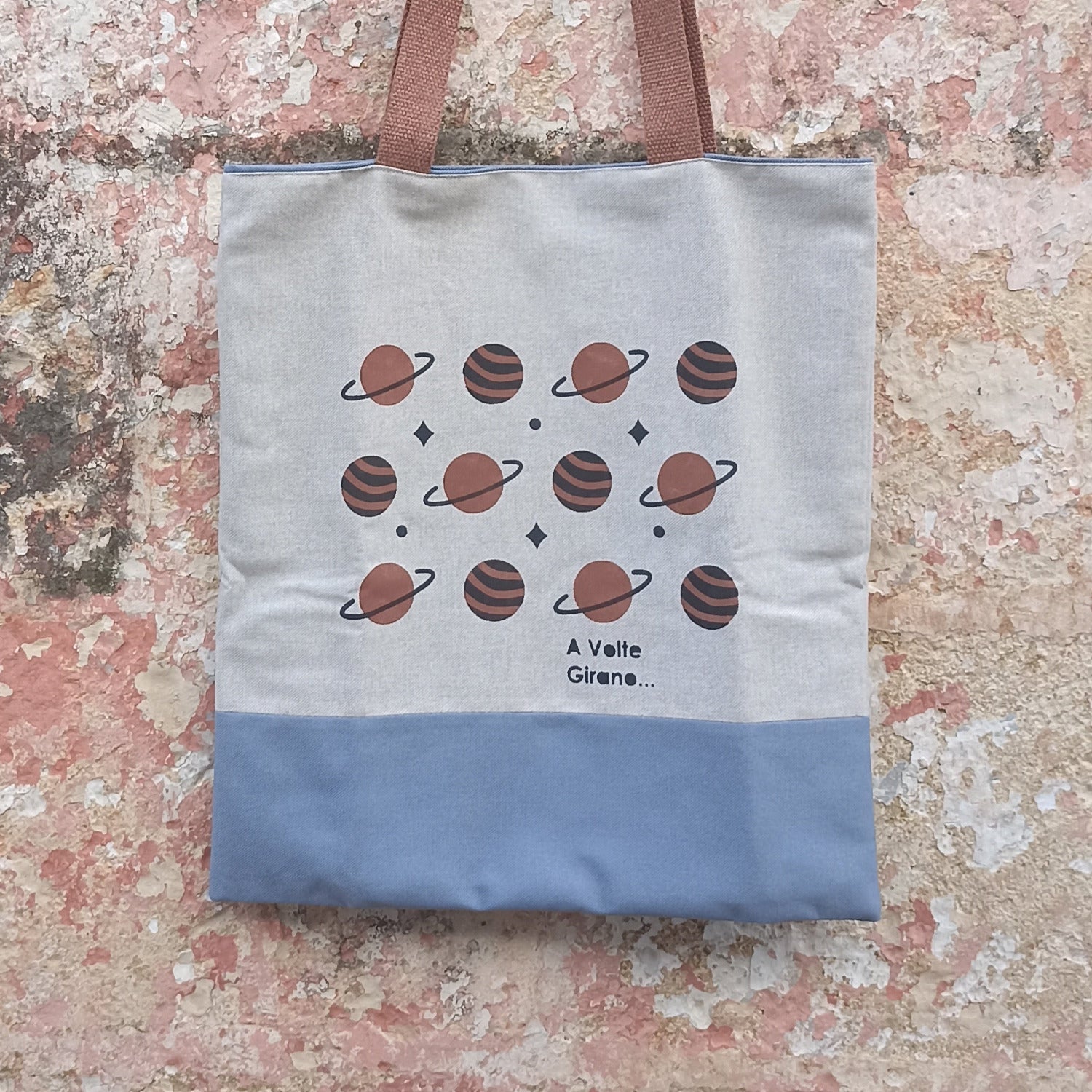 La shopper A Volte Girano è cucita e stampata a mano con tecnica stencil