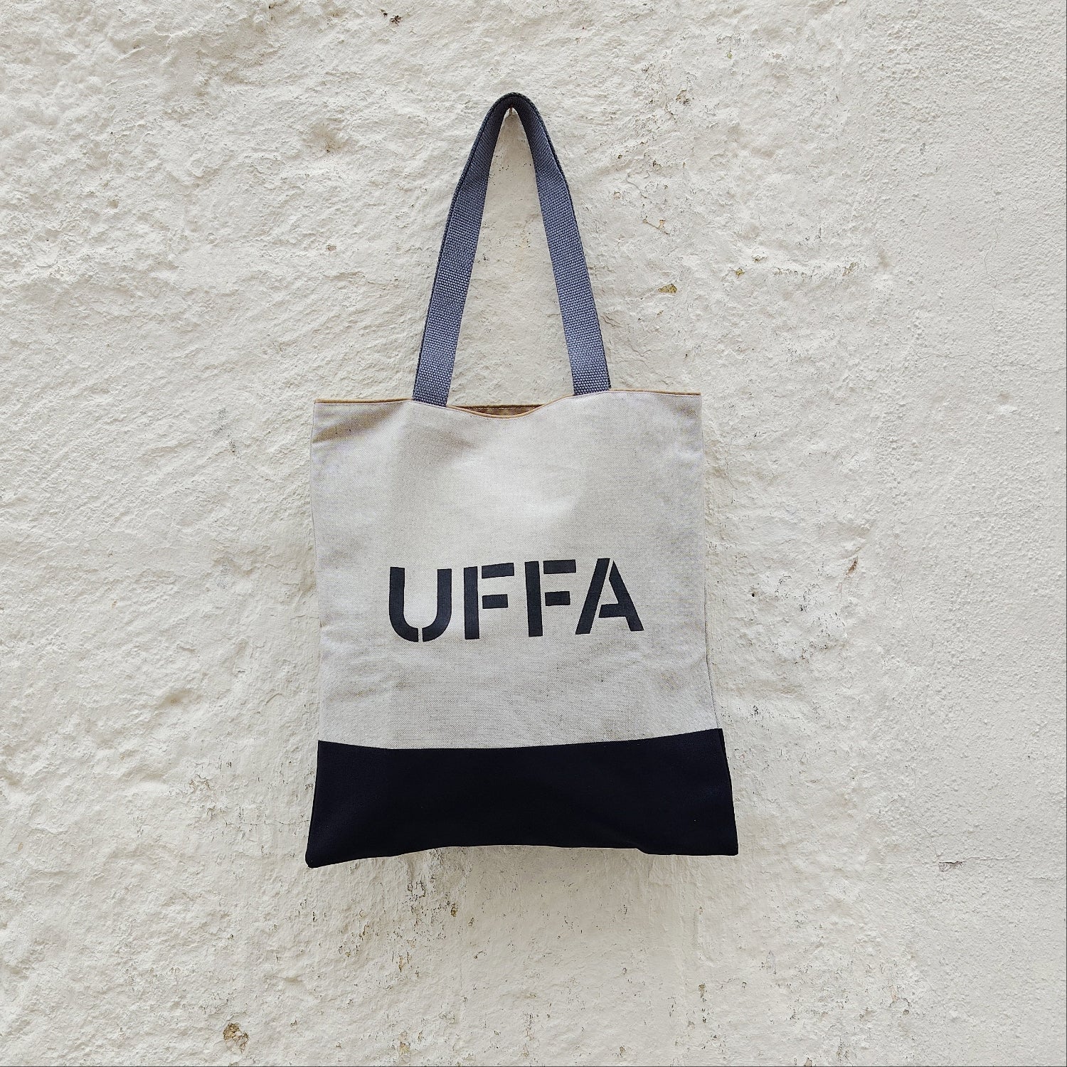 La shopper Uffa è cucita e stampata a mano con tecnica stencil