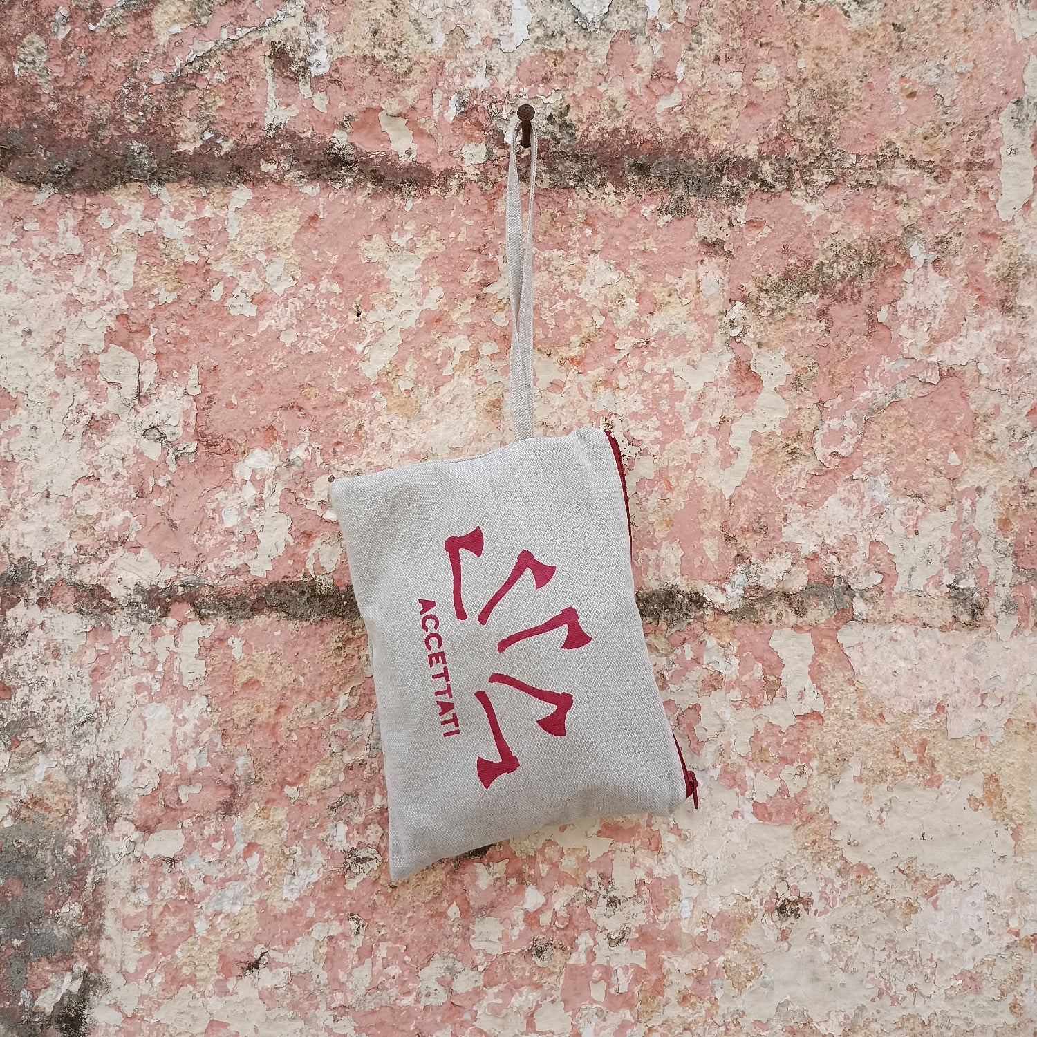 Pochette in cotone naturale, cucite e stampate a mano con tecnica stencil