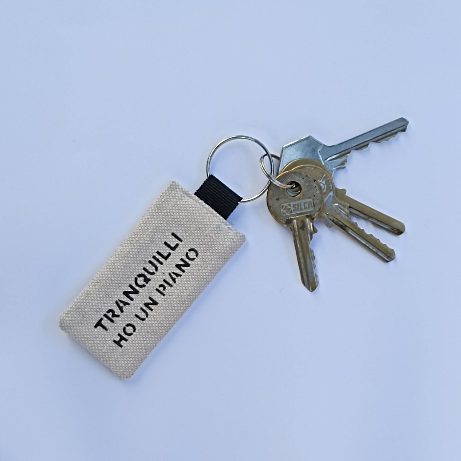 Portachiavi TRANQUILLI HO UN PIANO in cotone naturale stampato a mano con tecnica stencil