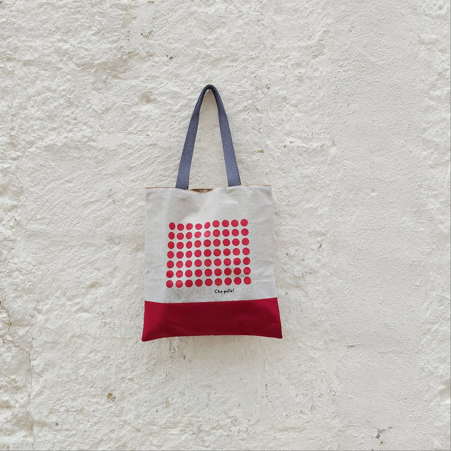 La shopper Che Palle è cucita e stampata a mano con tecnica stencil