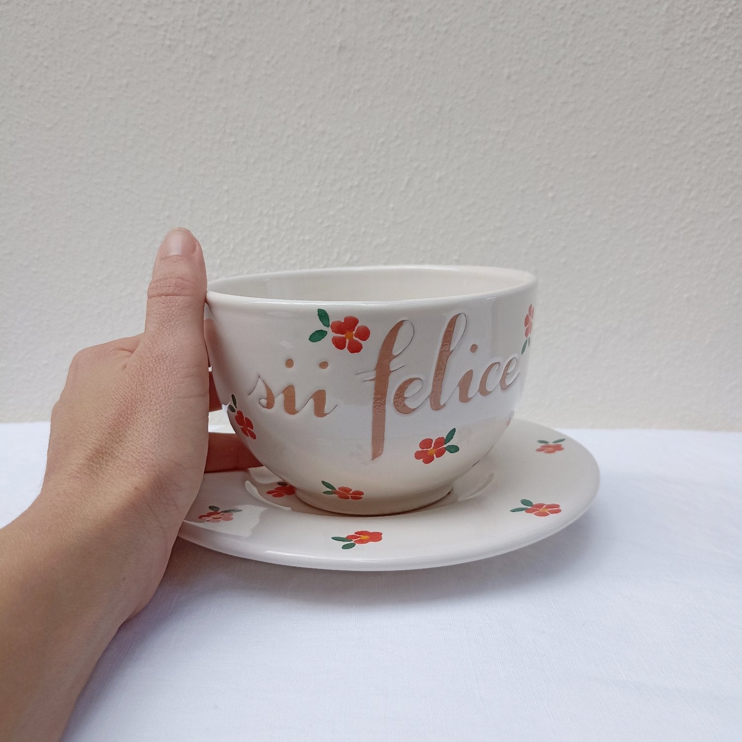 Ogni tazza è realizzata interamente a mano ed è venduta in abbinata con il piattino.